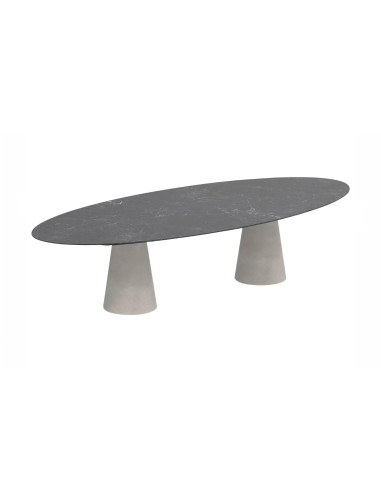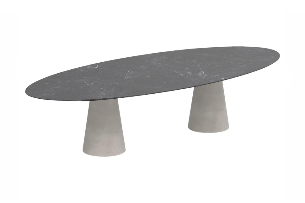 The Conix outdoor table by Royal Botania, designed by Kris Van Puyvelde, derives its name from the distinctive conical shape of its base, crafted from Ductal® fiber-reinforced concrete. The tabletops, available in various shapes and sizes (round, rectangular, square, or oval), can be made in the same finish as the base or in ceramic, allowing for unique combinations of materials and colors. All concrete surfaces are meticulously polished and treated to reduce porosity.