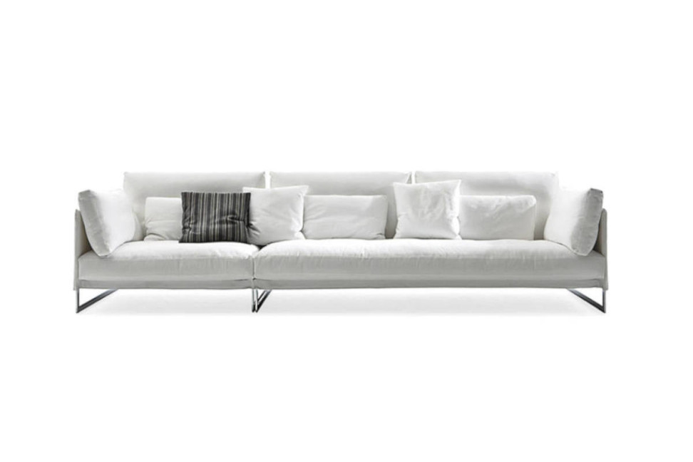 The Livingston Sofa by Saba, designed by Giuseppe Viganò, interprets the theme of comfort through a lightweight steel structure and a generous seat designed to embrace. The softness of the goose down cushions, contained in compartments covered with white cotton, interacts with the precise construction of the frame. The chrome steel feet give lift to the shape and visually lighten the volume of the sofa, making it suitable for both home and contract contexts.