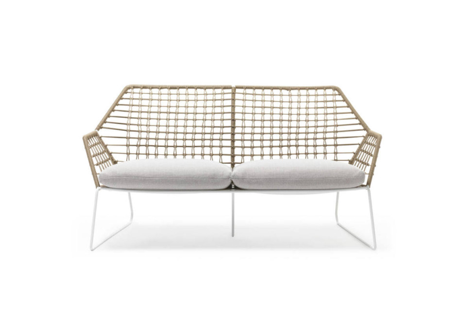 The New York Soleil sofa follows the elegant and enveloping shapes of the interior version but is enriched with a woven backrest made of polyethylene ropes entirely handmade. The new collection includes a sofa, an armchair, a chair and a stool. The New York Soleil outdoor sofa brings all the comfort of Saba indoor sofas to the outside, guaranteeing resistance and durability thanks to the use of a special technical fabric. The structure is available in white or anthracite grey, while for the covering you can choose from a wide range of shades.