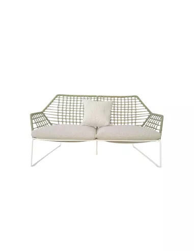 The New York Soleil sofa, in expo offer in our showroom, is an elegant design object that will not go unnoticed in your outdoor area. It is characterized by a white metal base, a backrest in Melange Green rope and a soft seat cushion covered in fabric in ecru colour.