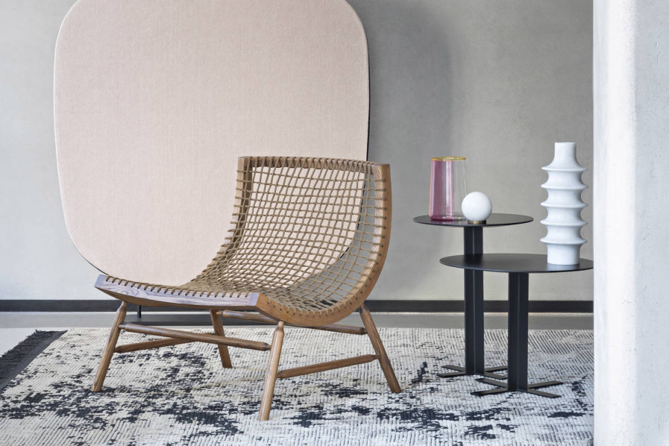 Part of the collection of armchairs of the Made in Italy brand Saba, the Sitar small armchair has an harmonic painted ash structure with seat and backrest formed by a nautical rope weave, available in various colors. The Sitar small armchair evokes exotic and distant atmospheres and combines comfort and contemporary design.