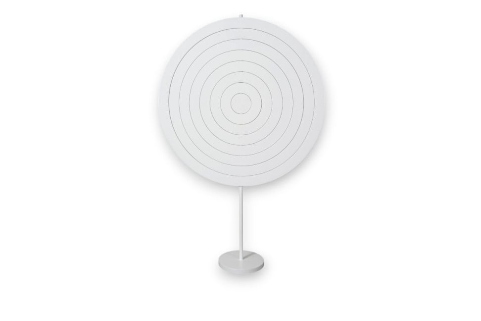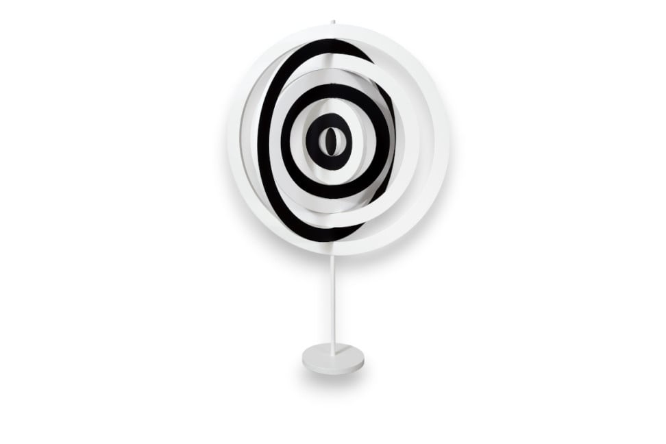 The kinetic artwork Globalization by artist Sandro Tomassini is characterized by eight concentric wooden rings, positioned within a white-painted metal structure, representing a world where white on one side and black on the other symbolize different races, religions, cultures, languages, and economies.
