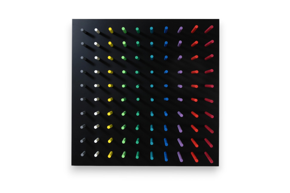 As the title "Order or Disorder" suggests, the cylinders can be arranged vertically or horizontally by color and increasing size, almost reminiscent of sports or military teams. However, the cylinders can be moved at will, creating a joyful confusion resulting from disorder.