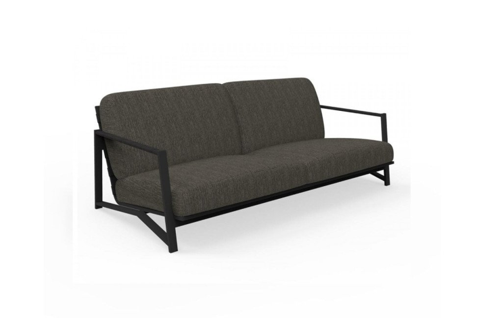 Cottage stands out for its structure with clean lines and slender shape that defines the seat giving it a light and aerodynamic look. Three different materials coexist together harmoniously: the aluminum of the structure available in the colors graphite, white and mokka, the synthetic strips that characterize the backrest and the seat, and the strings that elegantly intertwine around the armrest. The back and seat cushions are covered in weather-resistant fabric and are removable. The collection, in addition to the sofa, includes the armchair, the ottoman, the sunbed and a series of low tables.