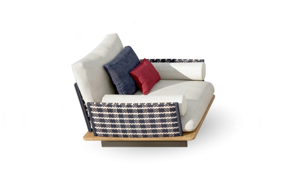 The Venice outdoor armchair by Talenti, created by the renowned designers Ludovica+Roberto Palomba, is a fascinating element within the Venice collection. This outdoor collection is inspired by the idea of elements 'floating' on water, and the armchair perfectly embodies this vision. The Venice outdoor armchair is presented as a work of art that evokes the image of a wooden raft gently floating on water. With its simple, minimalist wooden structure, the armchair seems to levitate in the air, creating an atmosphere of lightness and freedom. The solid and stable structure provides reliable support, while the large, fabric-covered cushions ensure maximum comfort. The addition of the lightweight woven backrests adds a touch of elegance and sophistication to the armchair. These backrests, which look like sails rising in the wind, push the imagination into a new dimension and create a unique and fascinating design. The Venice armchair is thus transformed into a work of art that captures attention and enriches any outdoor environment with its distinctive style.