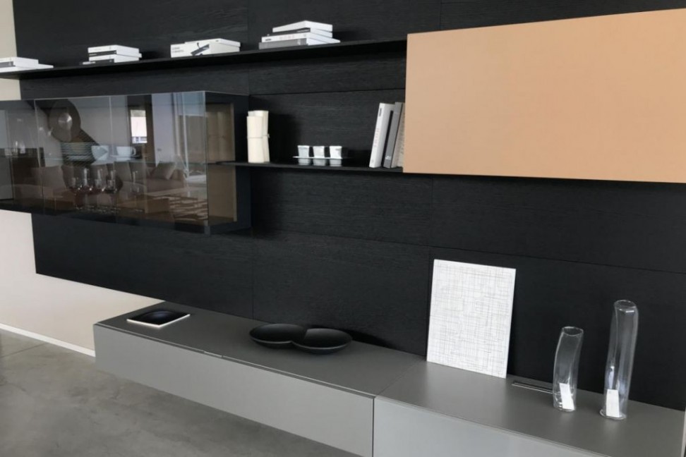 The Day Collection 12 day system, on expo offer in our showroom, is the perfect solution to organize the space and to furnish the living room with elegance. The back panels in fossil oak and the Arena mat lacquered and Cuoio Naturale mat lacquered accessories create a striking contrast; the glass doors highlighted by soft LED lights offer a further touch of style to the composition.