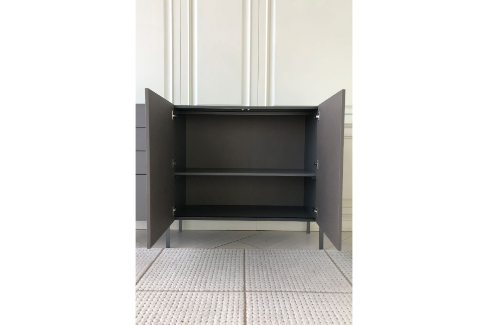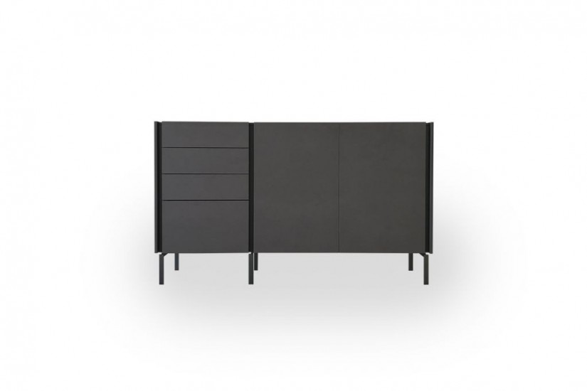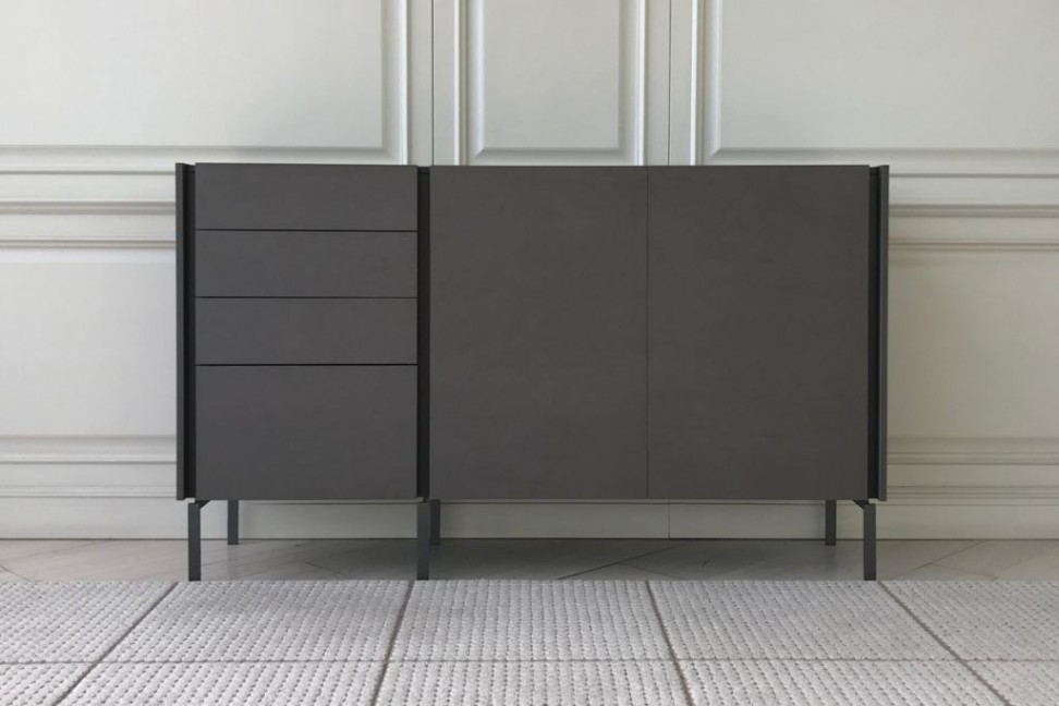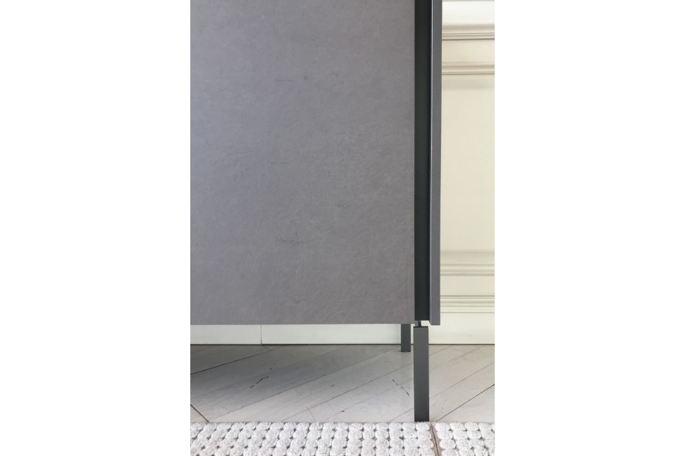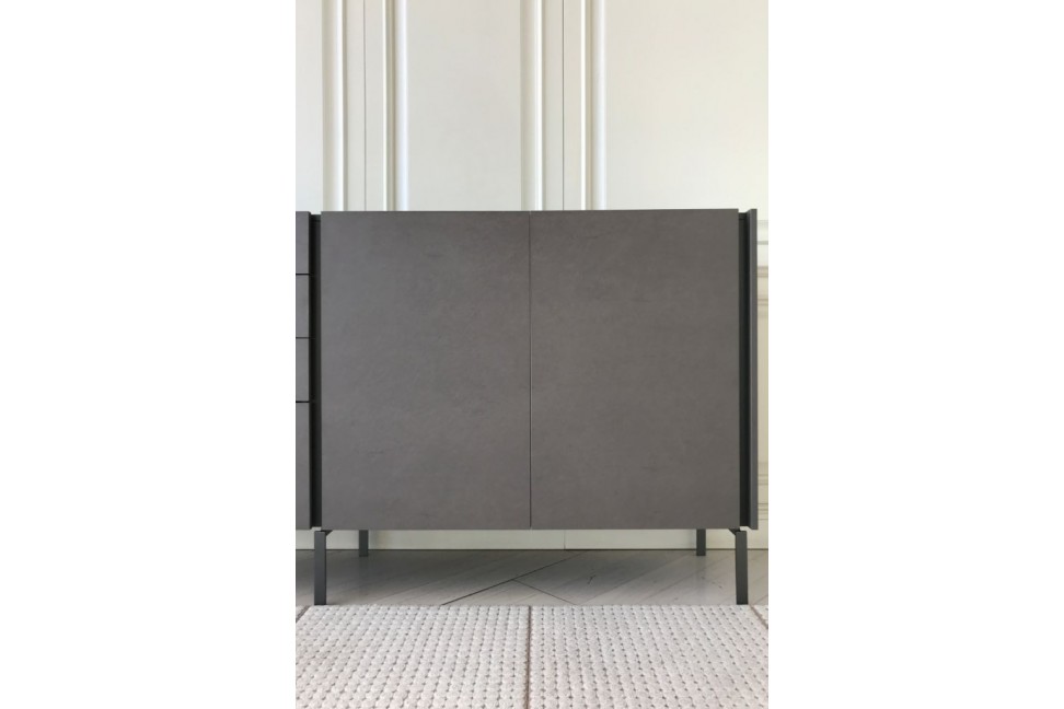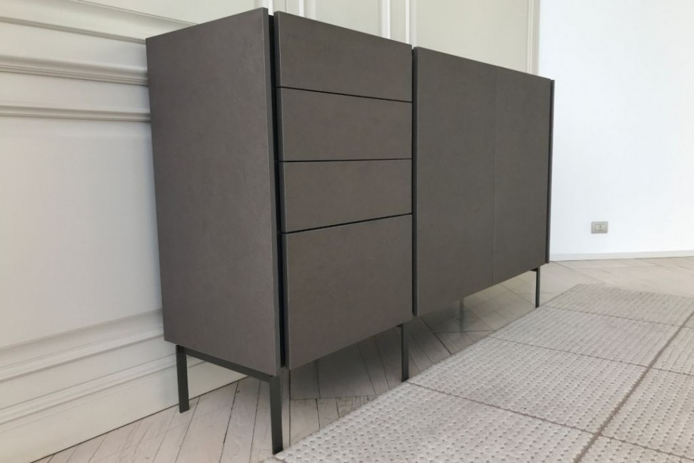 The Tato sideboard in Expo offer at our showroom rests on metal feet and has a melamine Concrete Bronze structure with matt modica lacquered top and groove.