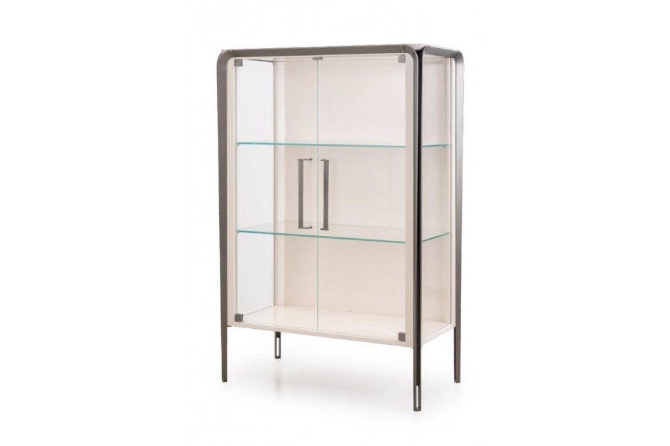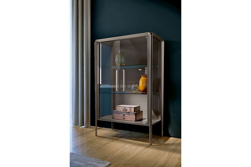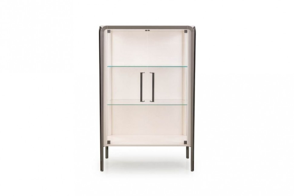 The showcase of the Milano collection is designed by the SBGA | Blengini Ghirardelli studio. This elegant piece of furniture wants to convey an immediate idea of lightness. The lacquered wood structure rests on metal legs with leather inserts and is completed by the glass doors and shelves. The Milano showcase is the ideal solution for storing and valorizing valuable items, giving to the living room a sophisticated and modern character.Turri