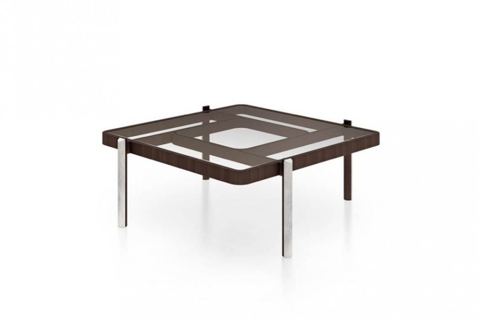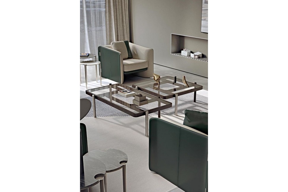 The tables of the Vision collection, new for 2021 designed by Andrea Bonini for the Turri brand, give a sense of harmonic geometry as well as lightness. The top, available in clear or bronzed glass, rests on thin wooden feet with marble inserts. The Vision tables are finally available in different sizes.Turri