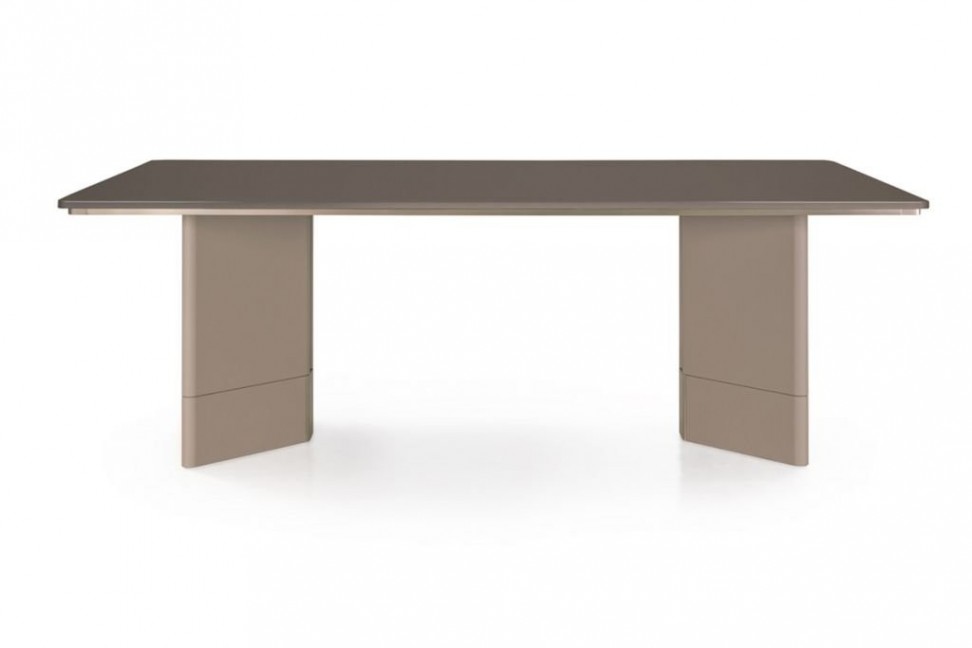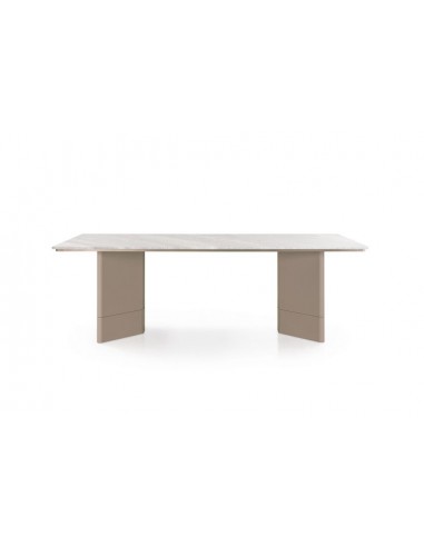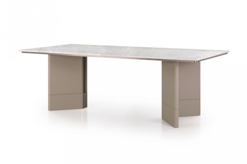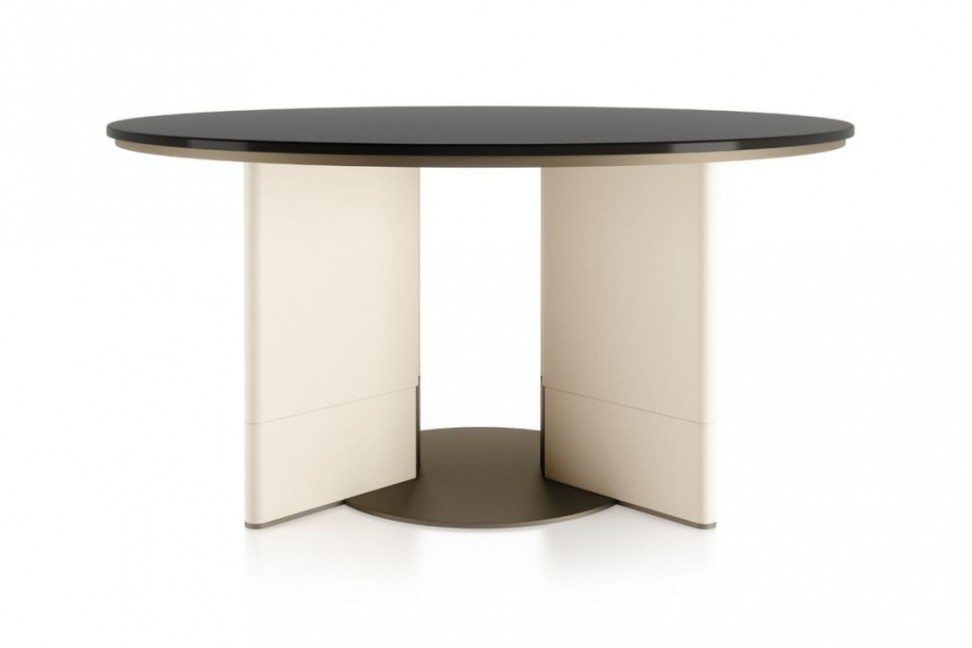 The table from the Zero collection, designed by Andrea Bonini for Turri, is characterized by its sculptural base, which takes shape from the intersection of two wings covered in leather. The legs support the elegant top, available in both marble and glossy lacquered wood. The Zero table is available in a rectangular version and in two round versions.Turri