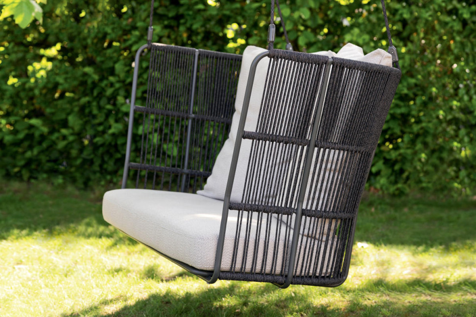This outdoor swing is available in two versions: with its own suspension frame or with simple ropes, allowing it to be hung from trees or beams for maximum customization of spaces.