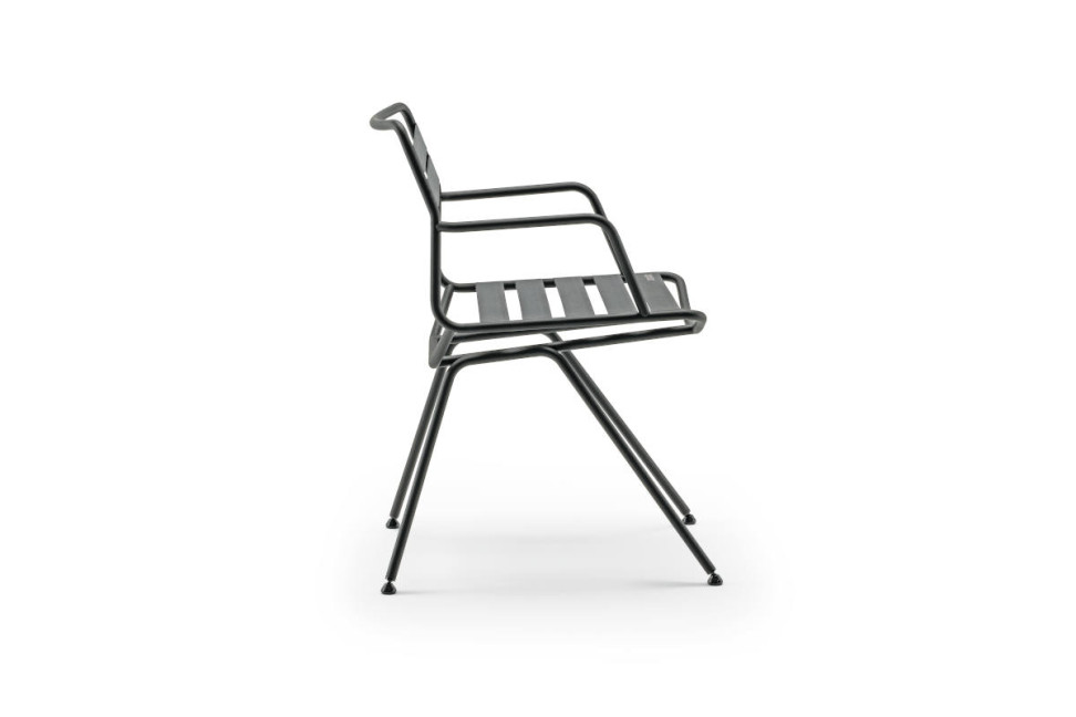 Characterized by a steel structure painted in iron gray or matt black color, Dan chair boasts a seat and backrest made with elastic bands in polyester yarn in yellow, rope, anthracite and blue. The Zanotta logo is printed on the first seat belt and placed on the right side. Dan 2057-2058 allows the customization of the printing of the straps. This chair is available also in the Outdoor version with the name Dan 2073-2074.