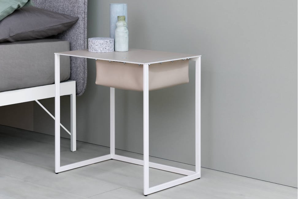 The Taschino 643 night stand is part of the appreciated novelties introduced by Zanotta, one of the most renowned Italian brand in the design furniture field. The Taschino 643 night stand with storage has frame and top in white, black or graphite painted steel. The storage is accessed by a drop-leaf opening, available in the left or right version. The top and the storage space are covered with pigmented hide leather.