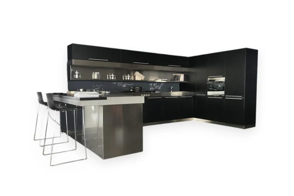 Bois chêne noir, poignée Artusi en acier. Bases et péninsule avec plan en marbre grabla mat et lames sp.4. Complète des suivants appareils électroménagers :