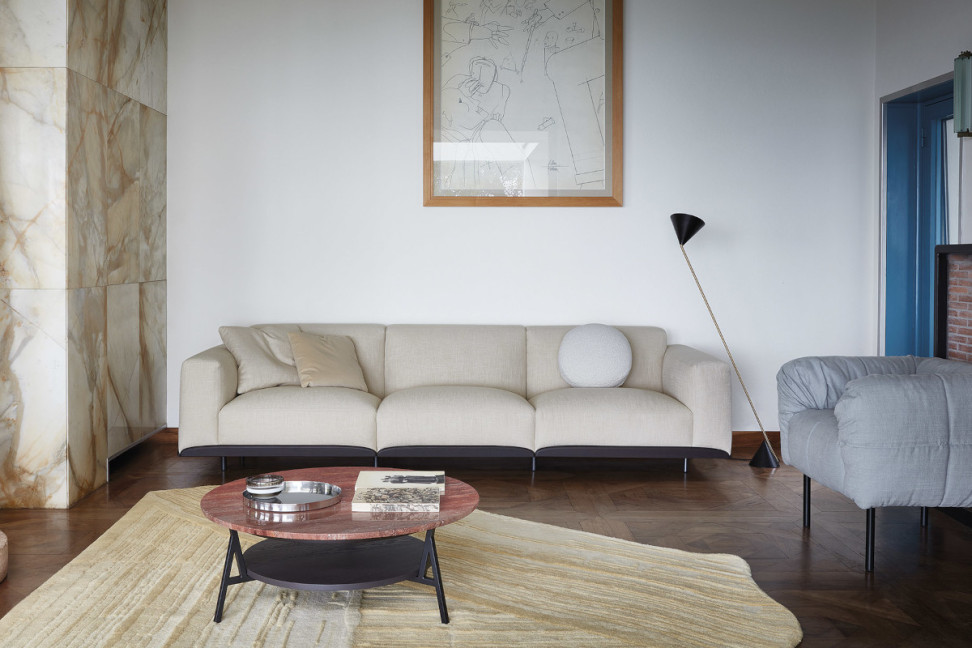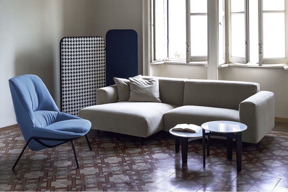 Le canapé Claudine d'Arflex, dessiné par Claesson Koivisto Rune, est un système modulable en tissu ou en cuir, caractérisé par des formes douces, une structure en métal et des détails en bois teinté chocolat