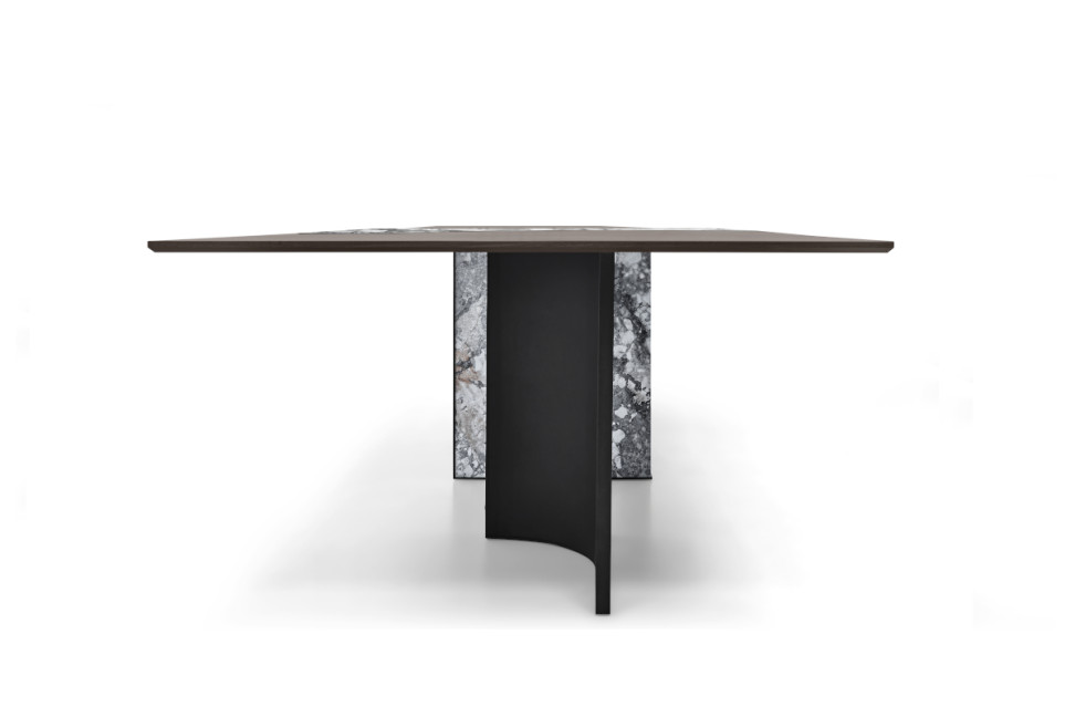 Millennium incarne le jeu harmonieux de contrastes et d'associations. Sa surface présente un plateau en marbre qui se marie au bois, créant un contraste visuel entre des matériaux qui, cependant, se respectent mutuellement. Les pieds de la table présentent un contraste supplémentaire entre le métal et le marbre, offrant une finition solide et élégante au design global. Cette combinaison d'éléments donne vie à une esthétique fascinante, où le minimalisme est exalté et valorisé plutôt que diminué.
