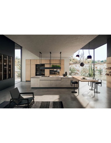 De plus, la recherche sur le travail des bois tranchés, effectuée par l'entreprise italienne, a permis l'utilisation d'essences avec des caractéristiques hautement représentatives du bois massif, comme les fissures du bois vécu et de ses nœuds caractéristiques, qui valorisent les nouveaux panneaux en bois Chêne Ancien de la cuisine Ak_04. Étant donné l'unicité du bois traité, chaque cuisine est unique et irrécupérable. Les nouvelles essences sont disponibles en trois teintes : Chêne Blond, Chêne Trani et Chêne Platine, toutes dans les finitions Flammé et Ancien.