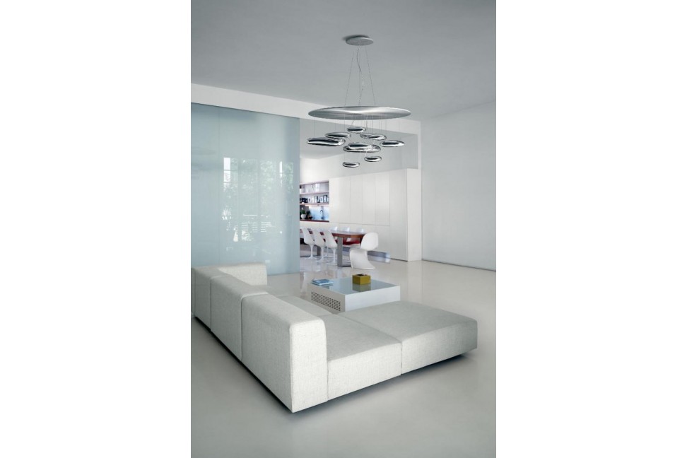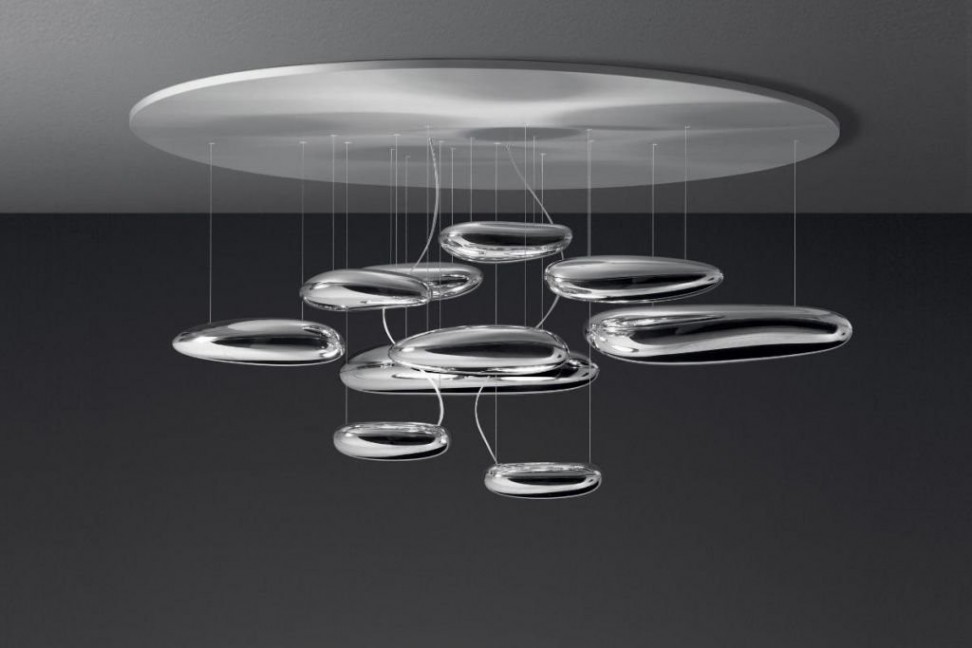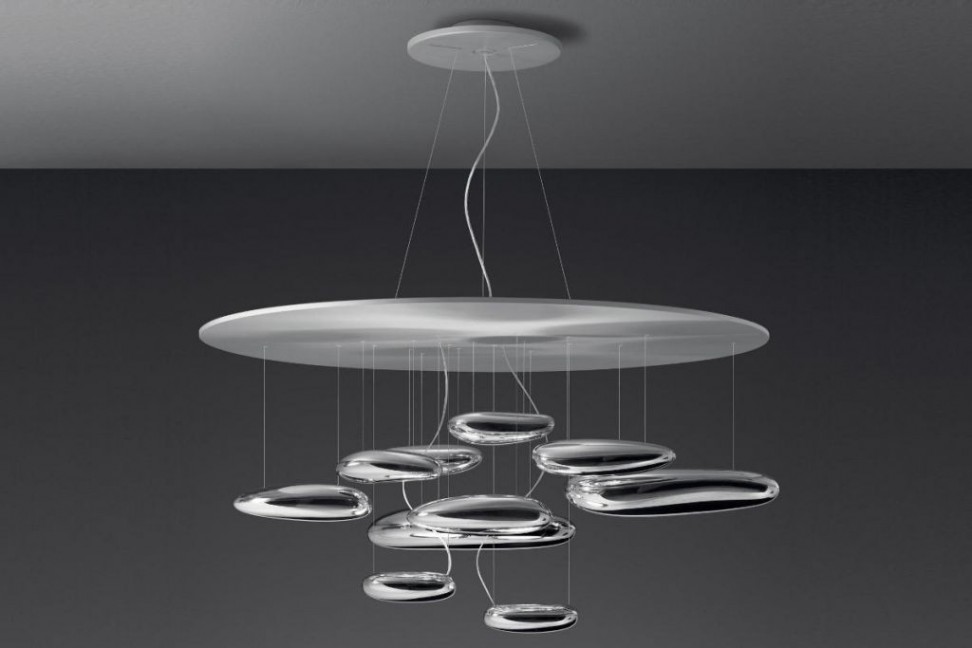 Le designer de renommée internationale Ross Lovegrove, en collaboration avec la marque italienne d'éclairage Artemide, est le génie créatif auteur de la collection de lampes Mercury, symbole d'une manière inédite d'exprimer et de représenter la beauté de la nature.La lampe suspendue Mercury présente une structure en aluminium et en matériau thermoplastique d'une configuration très particulière : elle est en effet composée d'un disque fin en aluminium auquel sont suspendus des éléments de différentes tailles qui rappellent la forme de pierres polies et qui semblent flotter dans l'air. La finition métallisée reflète la lumière et fait miroir aux couleurs de l'environnement environnant, créant un effet visuel captivant et des jeux de lumière fascinants. Mercury est également disponible en version plafond et “mini”, de dimensions réduites.