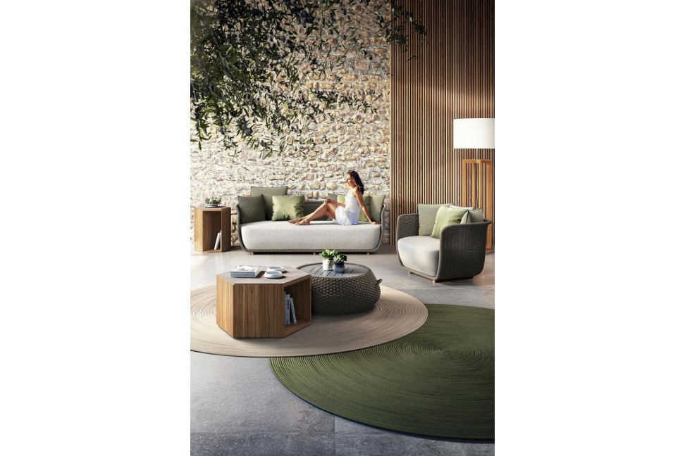 Confort et douceur se dégagent des formes sinueuses de ce canapé au style frais et contemporain, encadré par une coque enveloppante et attrayante, qui sert à la fois de dossier et de base, et est réalisé en corde à section circulaire de fibre acrylique Teflon tissée à la main. Ce matériau thermoplastique, imperméable et très résistant aux agents atmosphériques, est disponible en couleurs beige et gris et peut être associé à une structure en aluminium dans les couleurs blanc, graphite et effet teck. Le coussin d'assise doux et volumineux peut être réalisé, comme les coussins décos, dans des tissus acryliques, polyester et acrylique de luxe, tous des matériaux adaptés à l'exposition aux rayons UV et à séchage rapide. Bellagio, disponible en une seule dimension, fait partie d'un ensemble qui comprend également le fauteuil homonyme.