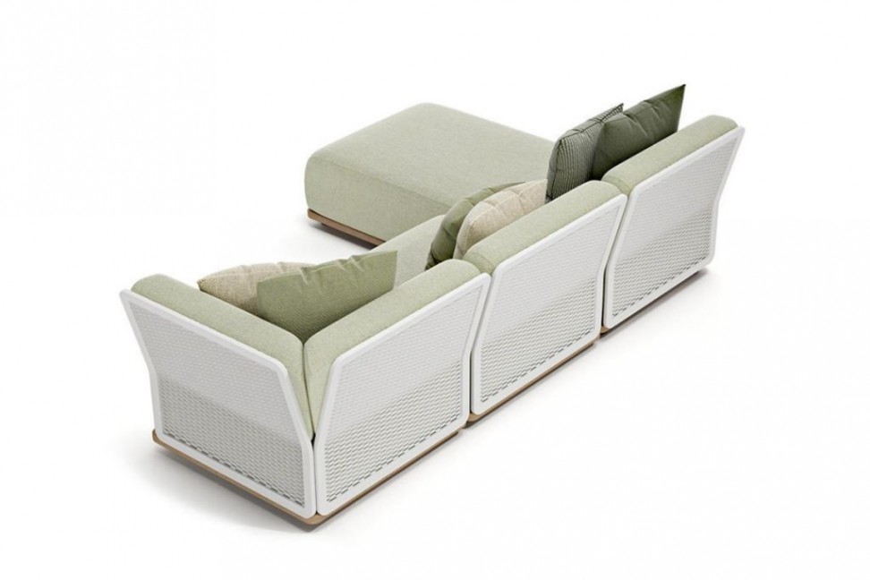 Le dossier de chaque module est constitué d'une structure en métal réalisée par un travail perforé qui évolue dans un tressage blanc particulier et attrayant, associé à une élégante base en aluminium de couleur miel effet teck, nouvelle finition de 2019. Le revêtement est quant à lui réalisé en tissus acryliques capables de résister à l'eau et à tout autre agent atmosphérique.
