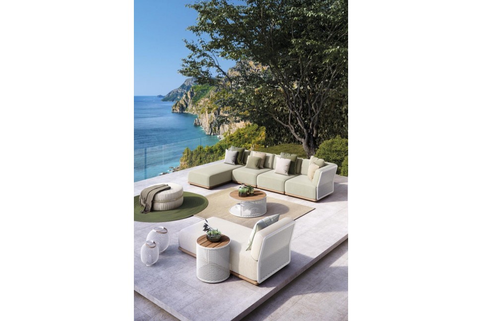 Switch est un canapé modulable qui peut satisfaire n'importe quel besoin d'espace, grâce à la possibilité de choisir le nombre et la disposition des différents modules centraux, d'angle et de chaise longue. Pour harmoniser l'ensemble de l'environnement, il est possible d'accompagner le canapé Switch avec d'autres compléments de la collection, comme la table basse, celle de service et le séparateur, qui reprennent ses traits caractéristiques, comme le métal tressé blanc, créant ainsi une atmosphère qui peut facilement se fondre avec tout l'environnement extérieur.