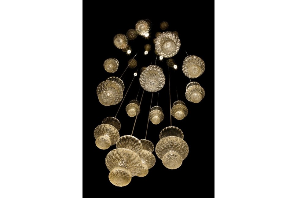 Spinn se distingue par sa configuration particulière en spirale, formée de pendants en verre dont la forme rappelle celle d'une poupée, éléments typiques de la tradition muranaise. Les pendants sont disponibles en cristal transparent ou en or et sont travaillés avec la technique du verre balotòn qui confère à la surface une texture tridimensionnelle capable de filtrer la lumière LED à l'intérieur de manière originale et captivante. La plaque en métal chromé contient d'autres spots qui, en se réfléchissant sur les éléments en verre, créent des ombres et des dessins dans la pièce. En plus de la version ronde, Spinn est également réalisée en version rectangulaire, où les éléments sont disposés en ligne, plutôt qu'en spirale. La lampe est disponible en cinq tailles différentes.