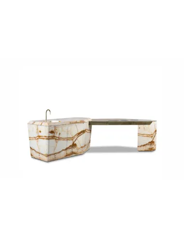 Le comptoir Laylah est disponible en pierre avec des détails en métal et cuir et est équipé d'une plaque de cuisson à induction. L'île est réalisable en deux dimensions différentes : cm.310x228x100h ou cm.380x235x100h.