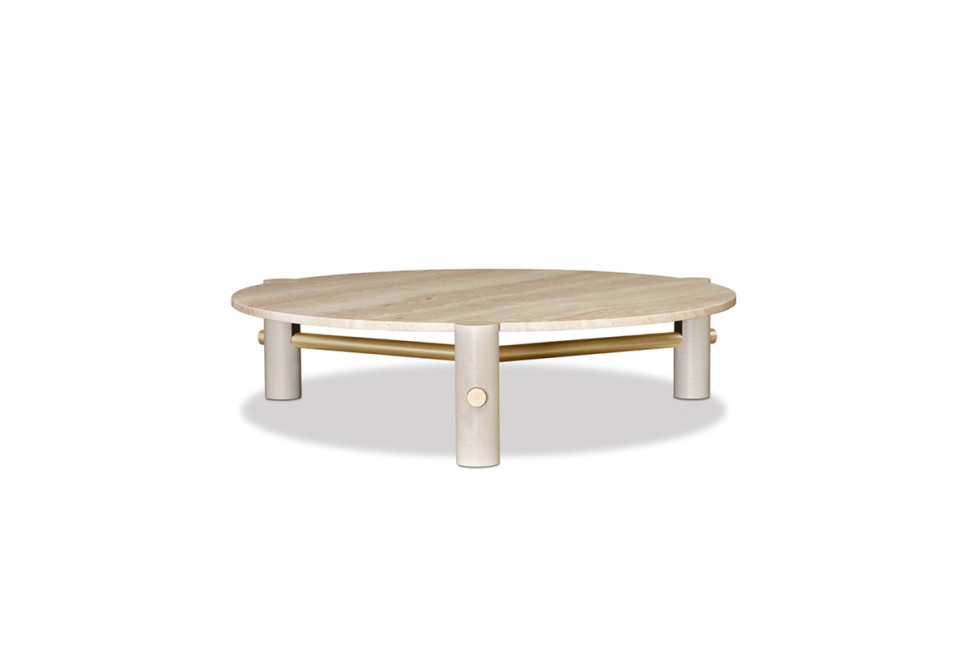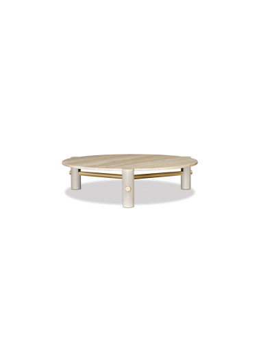 Cette table associe différents matériaux – bois, marbre et métal – créant un look élégant et complexe, parfait pour un salon raffiné et moderne. La base est formée de trois pieds cylindriques en bois massif d'érable, naturel ou teinté avec de l'aniline noire, reliés par des poutres en métal disponibles dans les finitions : laiton, bronzé ou nickelé. Le plateau du table basse Thalatha est en marbre Travertino White mat, enduit de résine transparente.