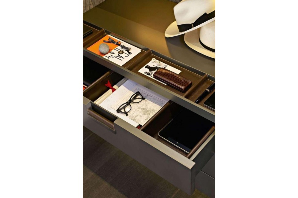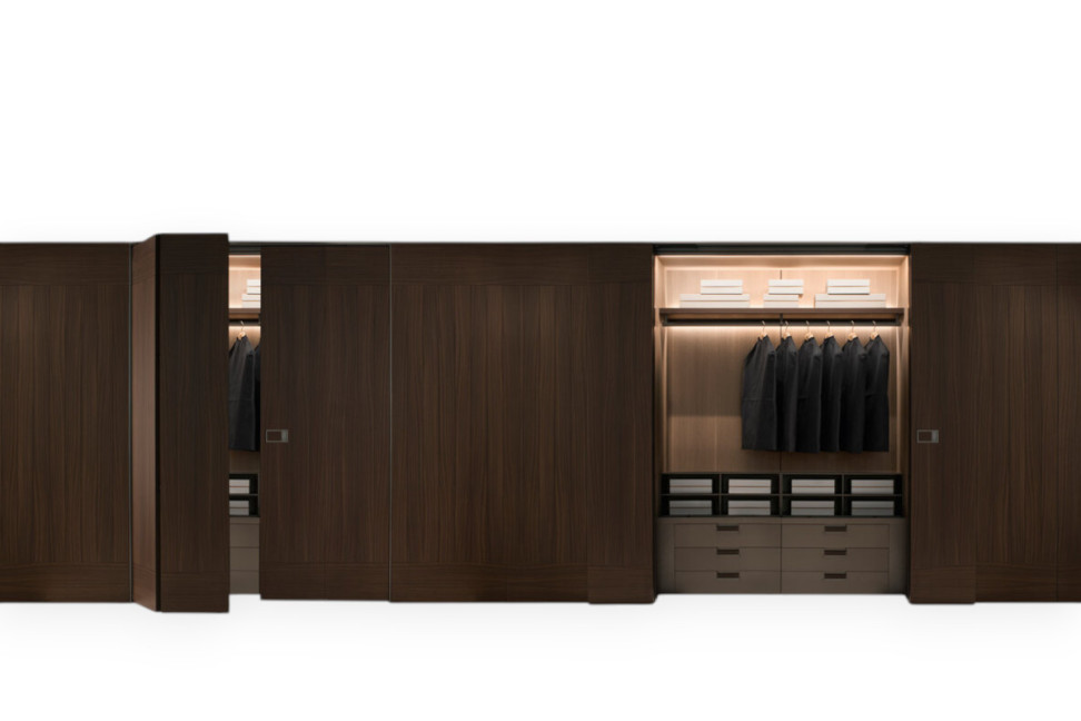 Les caractéristiques de la collection sont la haute fonctionnalité et le design essentiel et moderne, qui la rendent adaptée à divers types d'environnement. L'exclusivité de ces armoires modulaires se trouve dans le système innovant développé par le département technique de la marque Made in Italy, qui permet de faire pivoter simultanément les portes, réduisant ainsi l'encombrement.