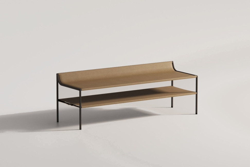 Le banc Quiet Lines présente une structure en métal et deux étagères rembourrées recouvertes de cuir. Grâce à sa surface suspendue en cuir sous le siège, le banc offre un espace de rangement pratique pour des objets tels que des couvertures, des passerelles pour le lit ou des pantoufles de chambre.
