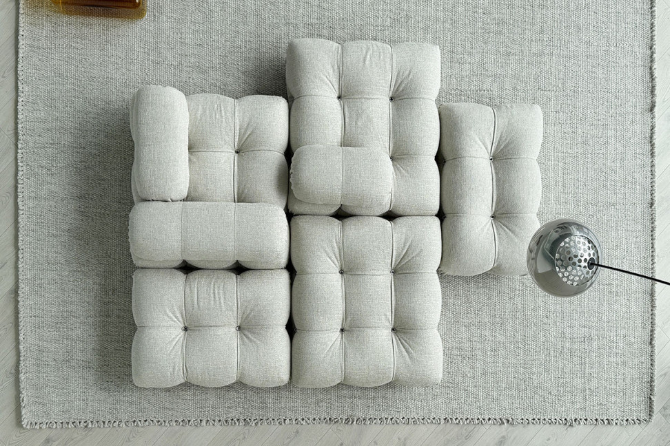 Le canapé Camaleonda en offre expo dans notre showroom se présente avec un doux revêtement couleur écru en association avec des pieds en hêtre naturel. Il est composé d'un élément d'angle et de quatre poufs pouvant être disposés selon les besoins d'espace.