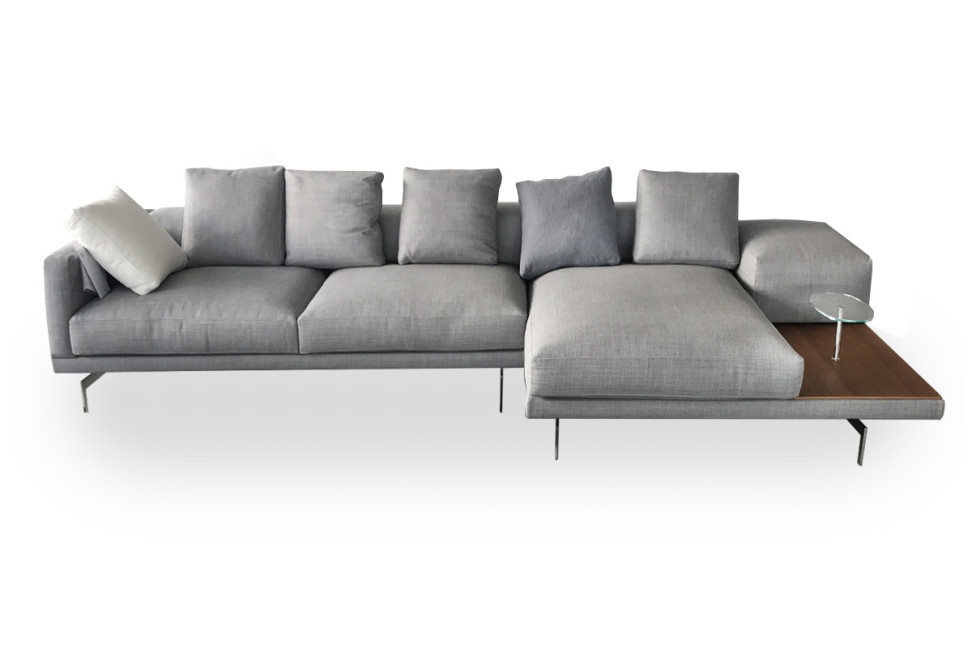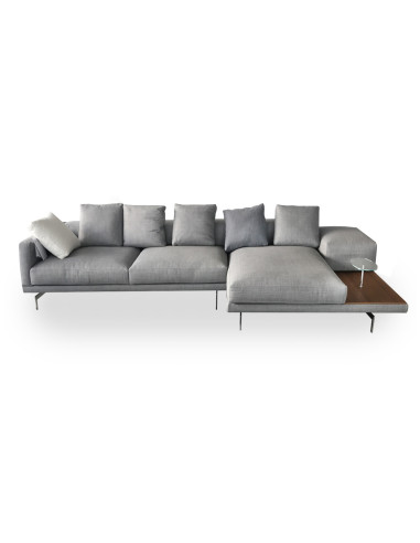 Le canapé Dock, en offre expo dans notre showroom, impressionne par son design moderne et ses détails originaux qui en font un élément de mobilier indispensable pour embellir l'espace de vie. Le revêtement en tissu gris pierre, associé aux pieds en métal chromé, apporte de la luminosité à l'environnement, tandis que le plateau latéral en noyer canaletto doté d'une table en verre transparent en garantit la fonctionnalité.