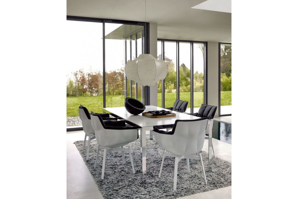 La chaise Husk de B&B Italia, conçue par Patricia Urquiola, est caractérisée par une coque moulée qui rappelle le capitonnage, conférant un aspect doux et accueillant. Le matelassage des coussins, fixé par des boutons-pression, rend la chaise encore plus distinctive et raffinée, répondant à un design qui mise sur la simplicité et le confort.