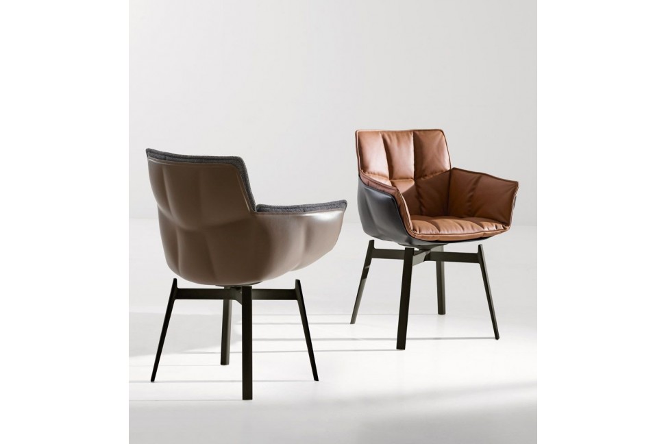 La chaise Husk de B&B Italia, conçue par Patricia Urquiola, combine une coque moulée qui évoque le capitonné avec un rembourrage matelassé, fixé par des pressions.