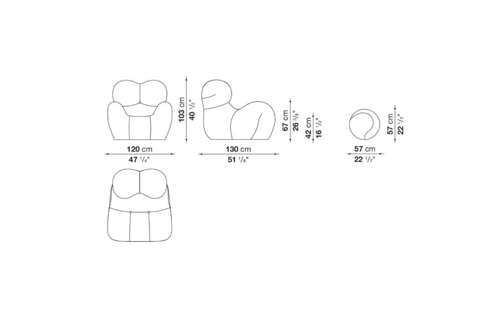 Dimensions : cm 120x130x103h (fauteuil) ; cm Ø57x57h (pouf).