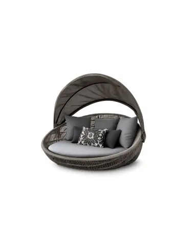 Le canapé Canasta ’13 rond de B&B Italia Outdoor, conçu par Patricia Urquiola, est un siège d'extérieur caractérisé par son tissage iconique léger et son auvent repliable qui offre une protection contre le soleil.