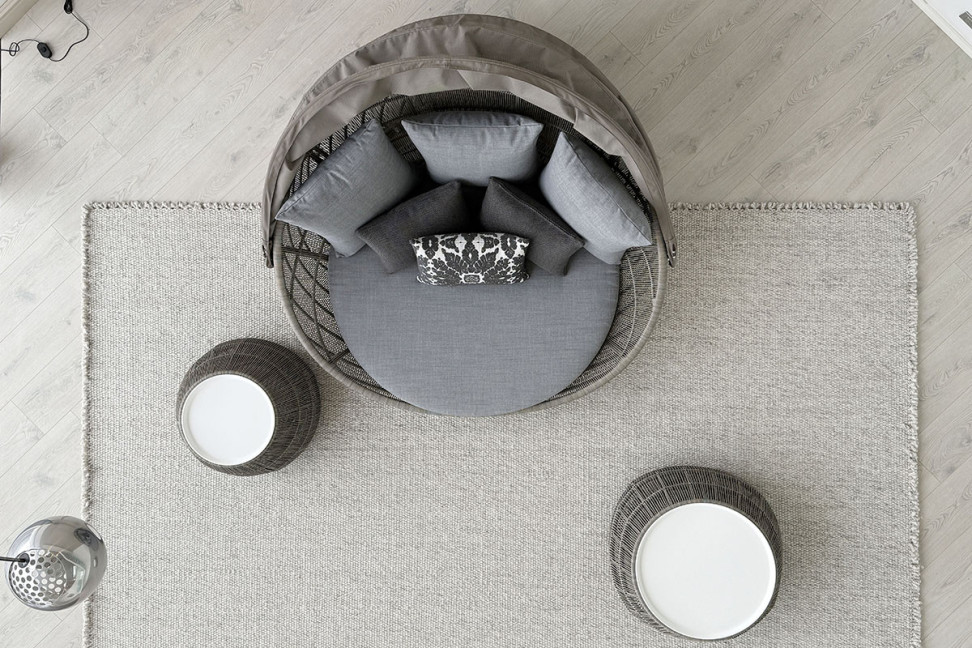 Le canapé rond Canasta ’13 en offre Expo dans notre showroom est proposé avec un coussin d'assise et un coussin de dossier en tissu gris anthracite, complétés par deux coussins décoratifs dans le même tissu et par un coussin avec motif floral gris et blanc. La structure et l'auvent sont de couleur gris taupe.