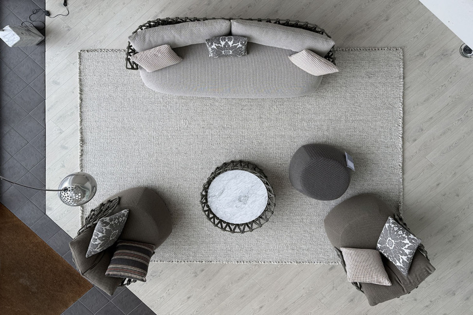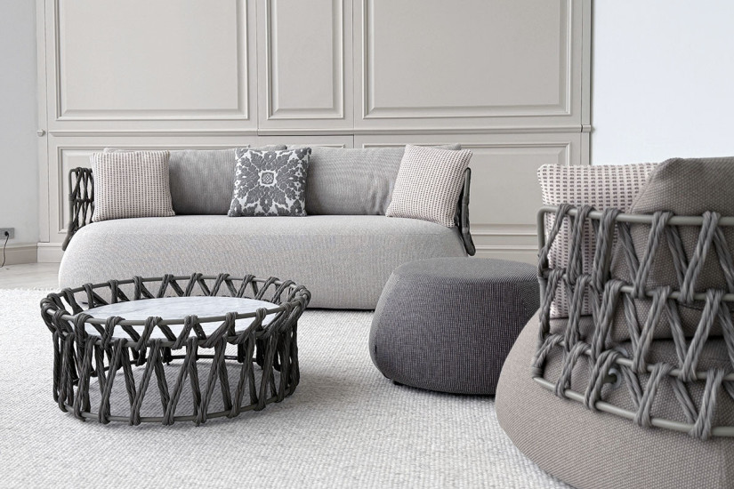 Le canapé Fat-Sofa Outdoor, conçu par Patricia Urquiola pour B&B Italia Outdoor, reprend la silhouette d'assise emblématique de la marque, déjà présente dans son catalogue, pour une utilisation en extérieur. Les lignes courbes et généreuses de la version intérieure reflètent fidèlement le modèle original, sans en altérer le caractère. Ce qui change, c'est le rapport à l'espace environnant: le tissage artisanal du dossier introduit une sensation de légèreté et une touche artisanale qui s'intègre parfaitement aux espaces extérieurs. Il ne s'agit pas d'un simple détail esthétique, mais d'une solution de design spécifiquement conçue pour les aménagements en plein air.