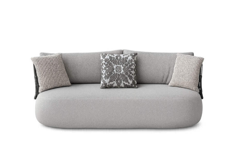 Le canapé Fat-Sofa 3 places de B&B Italia Outdoor, conçu par la designer Patricia Urquiola, est caractérisé par des formes rondes et généreuses de l'assise associées au dossier en métal avec un tressage fait à la main, qui confère légèreté visuelle et une signature artisanale distinctive.