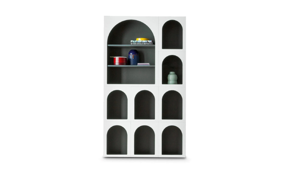 La bibliothèque Cabinet de Curiosité de Bonaldo, selon les mots du designer français, est inspirée par la pièce préférée de son grand-père parisien, son bureau, son Cabinet de Curiosité en effet, un lieu où, à côté des livres, se trouvaient des tableaux, des sculptures et bien d'autres choses. La bibliothèque Cabinet de Curiosité est composée de six modules différents qui peuvent être juxtaposés pour créer des solutions compositives personnalisées. Chaque module est composé de diverses fenêtres et niches où il est possible de placer des livres et d'autres objets. Ce complément de mobilier original est disponible avec une structure en bois laqué blanc avec un côté et des intérieurs en gris anthracite.