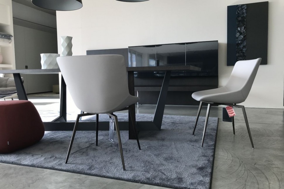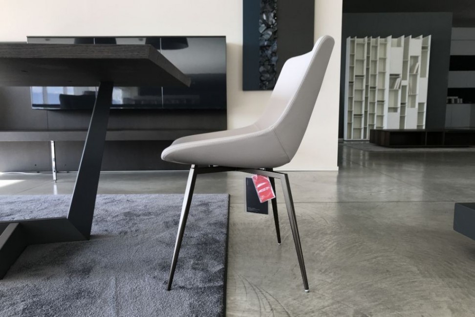 La chaise Artika en Offre Expo dans notre showroom est caractérisée par des pieds en métal peint en bronze mat et par une assise et un dossier entièrement recouverts en cuir de couleur gris taupe clair.