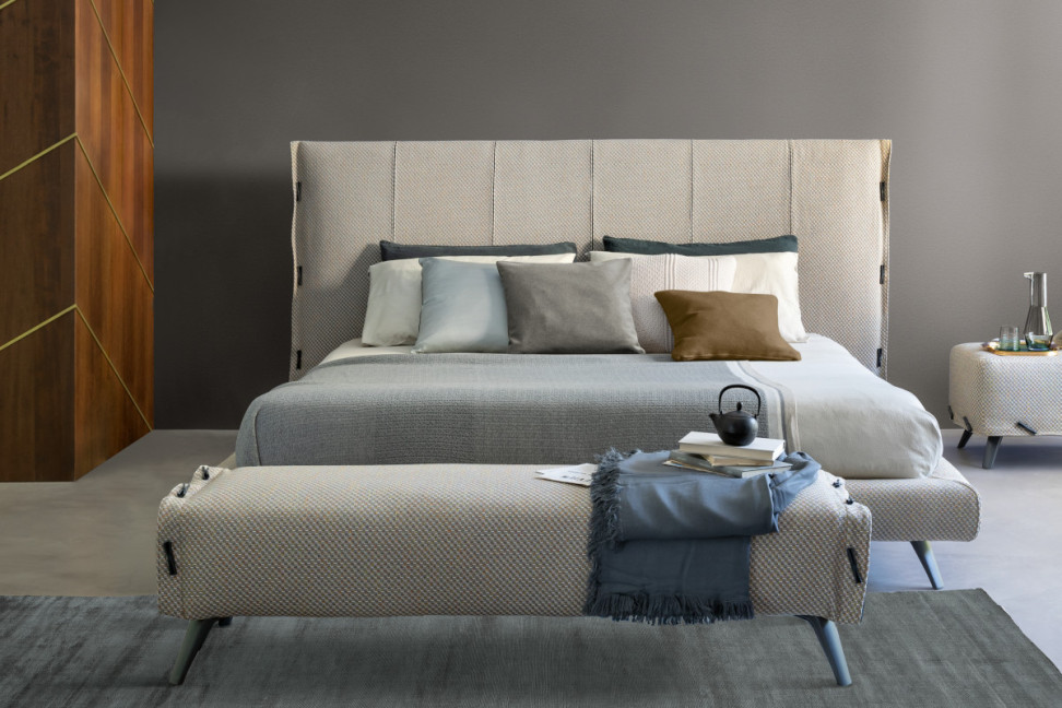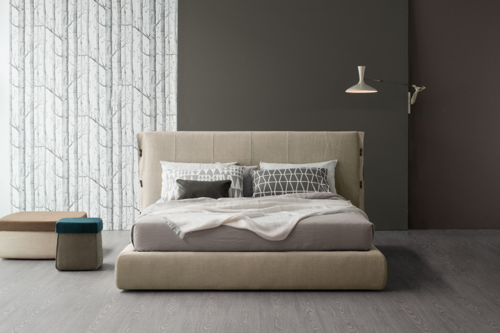 Le lit Cuff, conçu par Mauro Liparini pour Bonaldo, est un lit élégant enrichi par les galons qui ponctuent les bords de la tête de lit rembourrée et par les inserts en cuir qui embellissent le tour de lit.