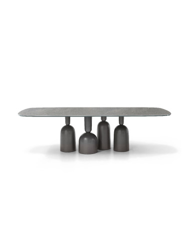 Conçu par Roberto Paoli, cette table revisite le concept de convivialité avec ironie et amusement sans renoncer à une touche de style et d'élégance. Les objets typiques du rassemblement, comme des bouteilles, des verres et des coupes de champagne, deviennent la base de la table Cop, un ensemble d'objets qui révolutionne la classique table dressée. La base est réalisée en métal peint en couleur unie ou en une combinaison de couleurs. Le plateau est disponible en bois, en cristal ou en céramique, il peut être rectangulaire avec des angles arrondis ou rond.
