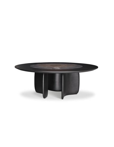 Cette table de design présente un plateau en bois plaqué avec une finition Noce Canaletto ou Chêne brossé Carbone. Le plateau intérieur pivotant en céramique offre un choix parmi 8 variantes luxueuses de la collection Bonaldo, du classique Calacatta au suggestif Rouge impérial. La base en polyuréthane haute intensité peut être sélectionnée en Bronze brossé ou Plomb brossé.