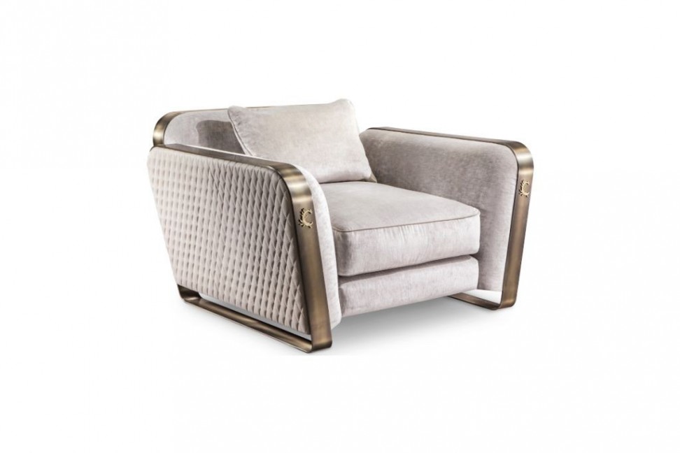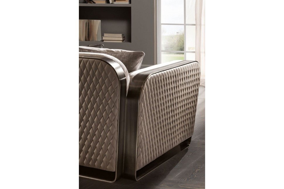Voyage est le fauteuil au goût vintage proposé par la marque Cantori. Ce fauteuil se caractérise par l'important signe graphique des profils en bronze, embellis sur les accoudoirs par la décoration de l'entreprise, et par le capitonnage présent sur le revêtement extérieur. Le fauteuil Voyage est proposé avec un revêtement en tissu.Cantori