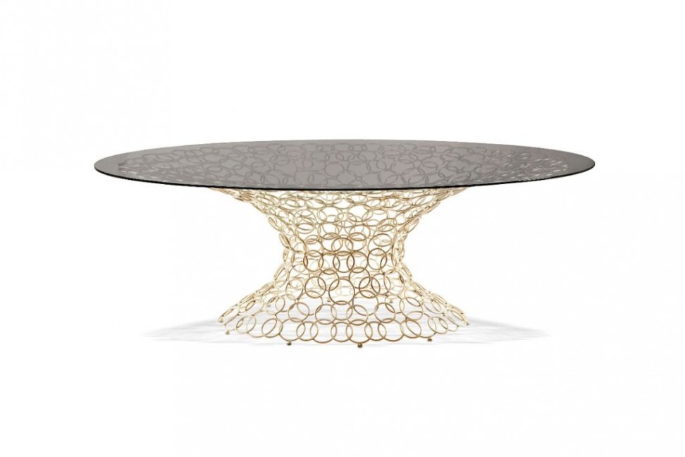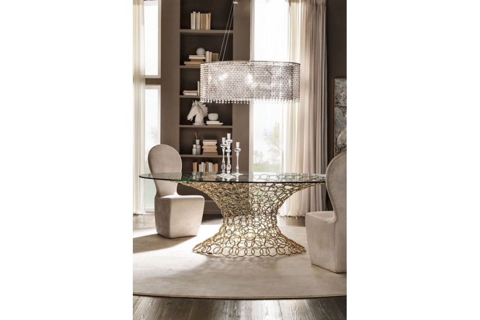 La table Mondrian Art Form renferme tout le savoir-faire des artisans Cantori. Le design unique de la base caractérise en effet cette table : une série de cercles en fer plein qui sont soudés un à un, créant un tourbillon qui soutient avec légèreté le plateau en verre. La table Mondrian Art Form est proposée à la fois avec un plateau ovale et avec un plateau rond, et les deux versions sont disponibles en différentes tailles.Cantori