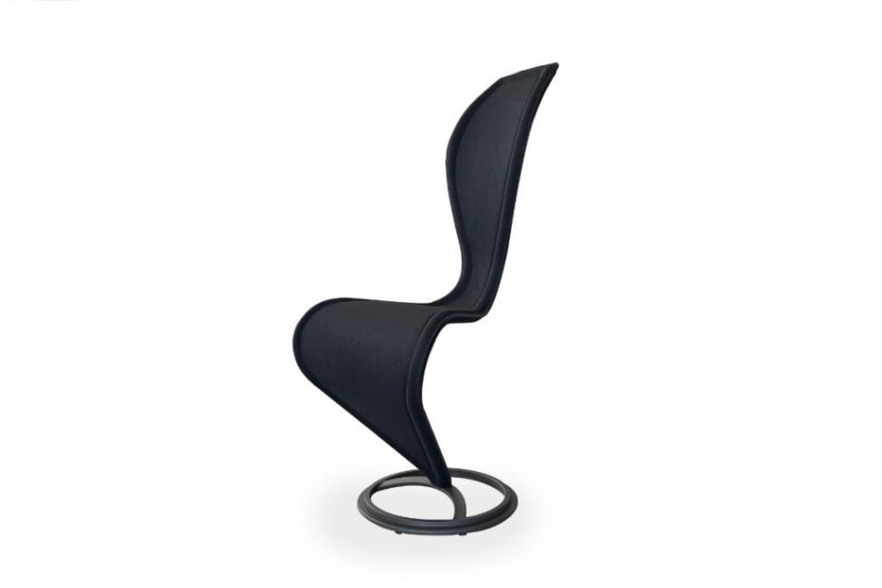 La chaise S-Chair en Offre Expo dans notre showroom présente une base en acier peint marron foncé et un revêtement en tissu noir.