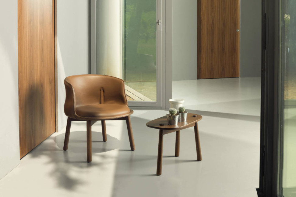 La chaise Peg de Nendo en partenariat avec Cappellini se caractérise par une forme basse et sinueuse qui repose sur des pieds en bois massif disponibles dans différentes finitions, notamment frêne blanchi, chêne teinté, wengé teinté et noir teinté. Les pieds pénètrent dans les côtés du dossier, une solution intelligente que le studio Nendo a adoptée pour assurer le bon soutien du dos de ceux qui s'installent dans le fauteuil, garantissant un siège confortable. Les chaises Peg offrent des revêtements fixes en divers tissus et cuirs de luxe ; la libre combinaison entre le tissu de l'assise et celui du dossier est permise.