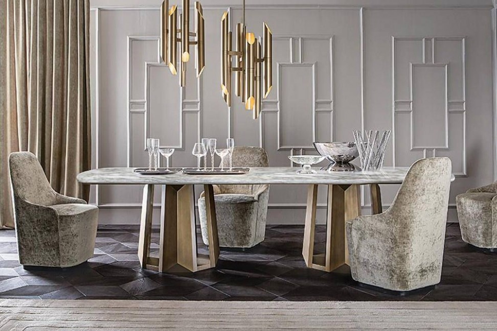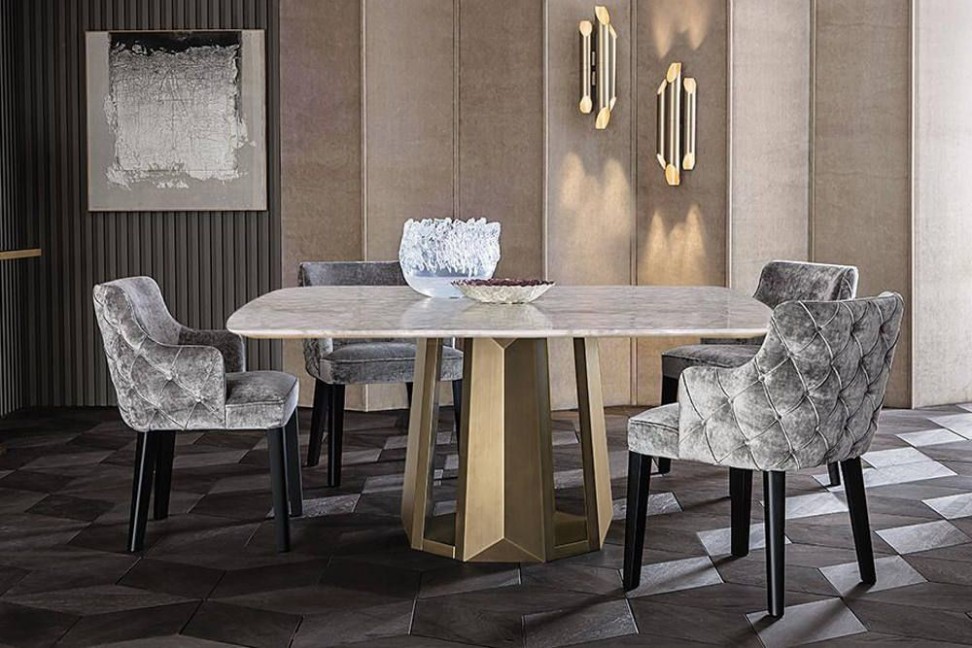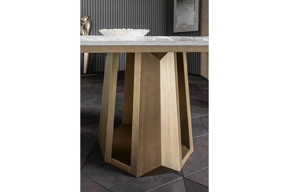 Casamilano réalise la table Kandinsky avec un plateau en marbre ou en bois, et une base avec finition en laiton brossé.
