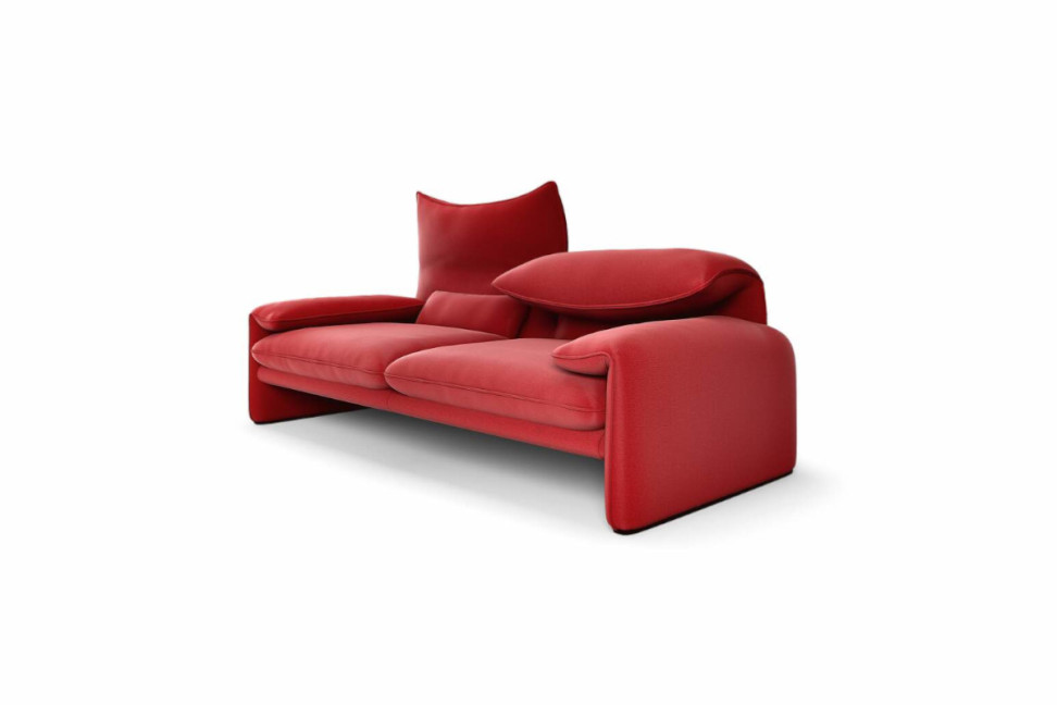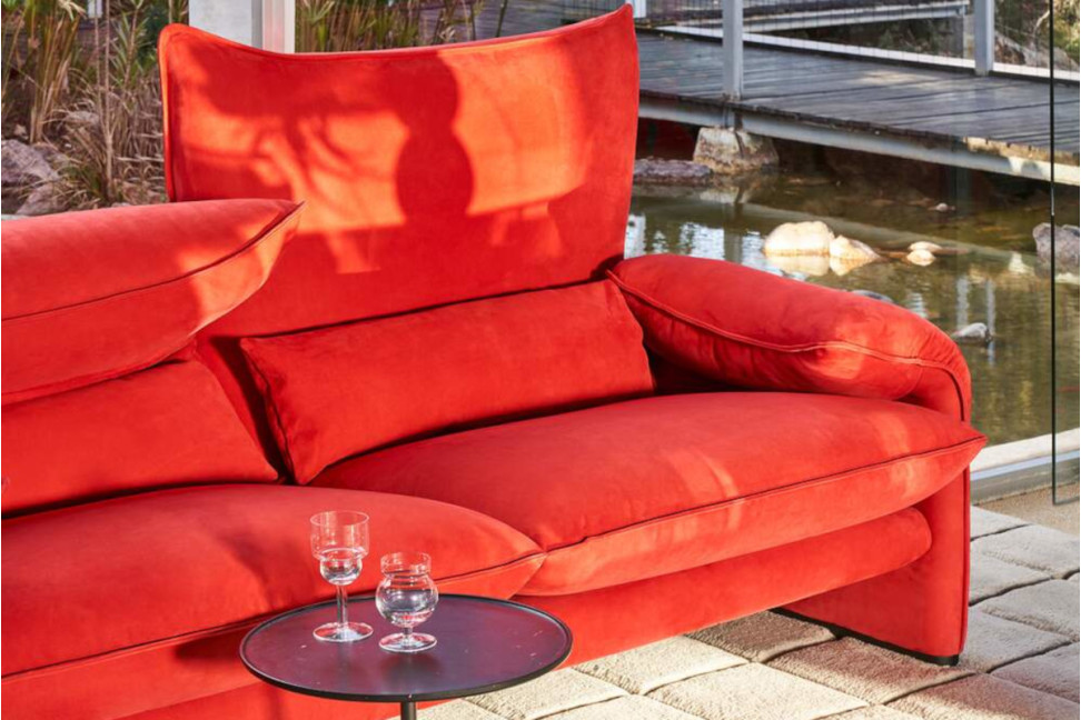 Le canapé Maralunga 50 de Cassina, conçu par Vico Magistretti, est une édition exclusive en cuir Nabuk rouge qui célèbre l'entrée du designer dans la collection iMaestri, tout en préservant le célèbre mécanisme réglable du dossier.